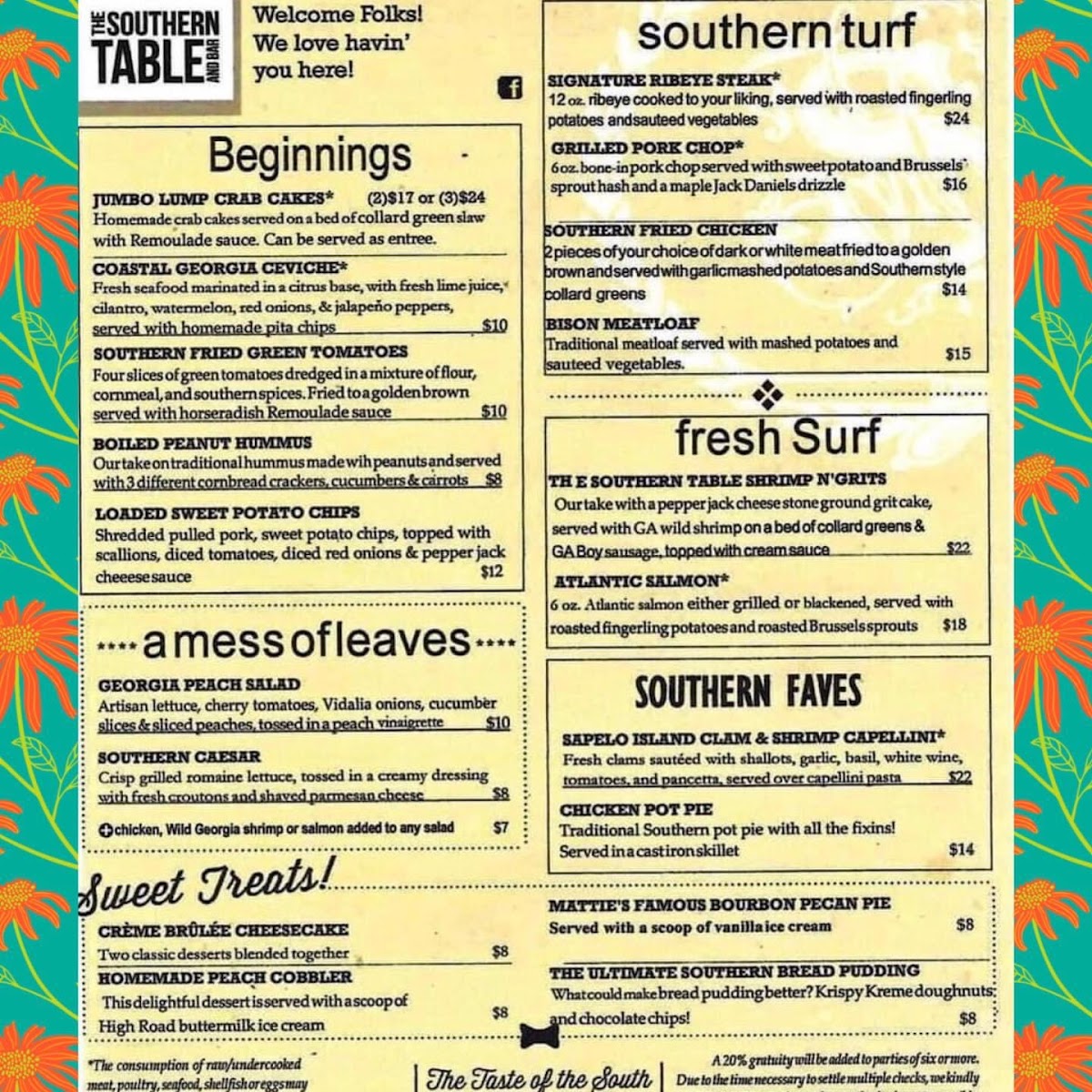 At Southern Table Boom Boom Bar Menu, the flavors of the South come alive with a variety of dishes that are as bold as they are delicious. Whether you’re in the mood for classic comfort food or craving something with a twist, this menu has something to satisfy every appetite. From savory appetizers to hearty main courses, each dish is crafted to showcase the rich, mouthwatering flavors of Southern cooking. If you're a fan of fried goodies, barbecue, or flavorful seafood, you’re in for a treat. Pair your meal with one of their signature drinks, and you’ve got a dining experience you won’t soon forget. Every item is designed to bring a little bit of Southern warmth to your table, making it the perfect spot to enjoy great food and good company.